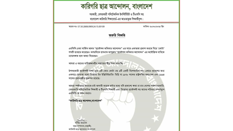 বিজ্ঞপ্তিতে বলা হয়, এনসিপি নেতা সারজিস আলম ‘প্রকৌশল অধিকার আন্দোলন’-এর প্রতি সমর্থন জানাতে গিয়ে ‘কোটা’ শব্দ ব্যবহার করেছেন। অন্যদিকে, হাসনাত আব্দুল্লাহ এই আন্দোলনের দাবি ন্যায়সংগত বলে মন্তব্য করেছেন। সংগঠনটির দাবি, এসব বক্তব্য দায়িত্বজ্ঞানহীন এবং বিভ্রান্তিকর।