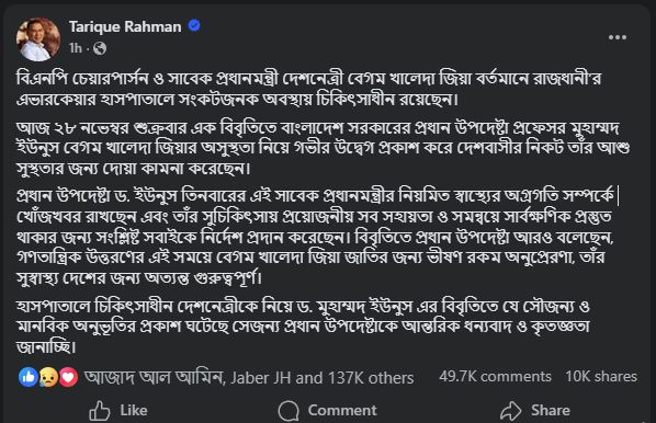 খালেদা জিয়ার সুস্থতা কামনার জন্য প্রধান উপদেষ্টার প্রতি তারেক রহমানের কৃতজ্ঞতা