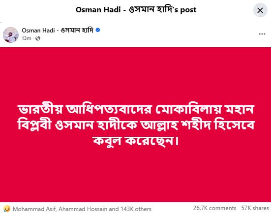 রাত ৯টা ৪৪ মিনিটে দেয়া ওই পোস্টে লিখা হয়েছে, ‘ভারতীয় আধিপত্যবাদের মোকাবিলায় মহান বিপ্লবী ওসমান হাদিকে আল্লাহ শহিদ হিসেবে কবুল করেছেন।