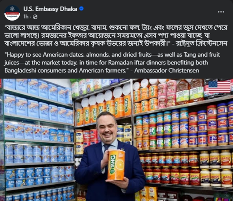 পোস্টে মার্কিন রাষ্ট্রদূত লিখেছেন, বাজারে আজ আমেরিকান খেজুর, বাদাম, শুকনো ফল, ট্যাং এবং ফলের জুস দেখতে পেয়ে ভালো লাগছে। রমজানের ইফতার আয়োজনে সময়মতো এসব পণ্য পাওয়া যাচ্ছে, যা বাংলাদেশের ভোক্তা ও আমেরিকার কৃষক উভয়ের জন্যই উপকারী।