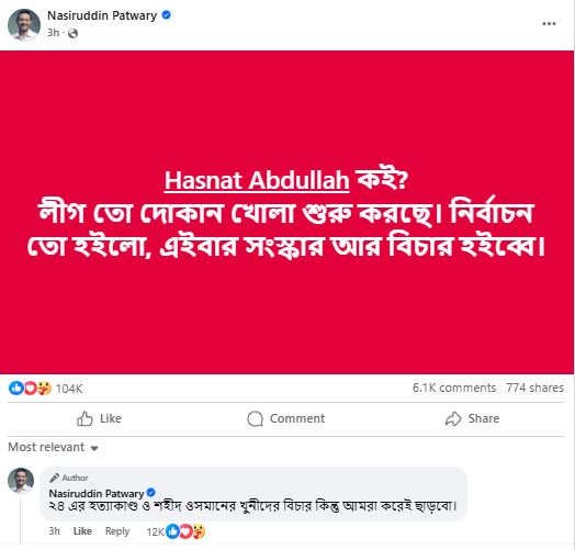 এছাড়াও স্ট্যাটাসের মন্তব্যের ঘরে নাসীরুদ্দীন পাটওয়ারী আরও লিখেছেন, ‘২৪ এর হত্যাকাণ্ড ও শহিদ ওসমানের খুনিদের বিচার কিন্তু আমরা করেই ছাড়বো।’