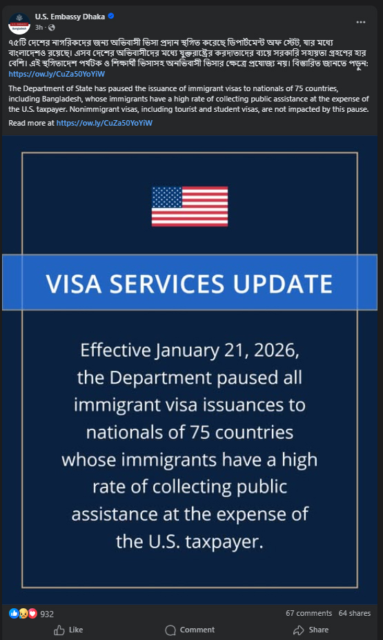 পোস্টে বলা হয়েছে, ২০২৬ সালের ২১ জানুয়ারি থেকে কার্যকর হওয়া এই সিদ্ধান্তের আওতায় বাংলাদেশসহ ৭৫টি দেশের নাগরিকদের অভিবাসী ভিসা দেওয়া স্থগিত করা হয়েছে। কারণ হিসেবে উল্লেখ করা হয়েছে, এসব দেশ থেকে আসা অভিবাসীরা যুক্তরাষ্ট্রের সরকারি সহায়তার ওপর বেশি মাত্রায় নির্ভরশীল হয়ে পড়েন।